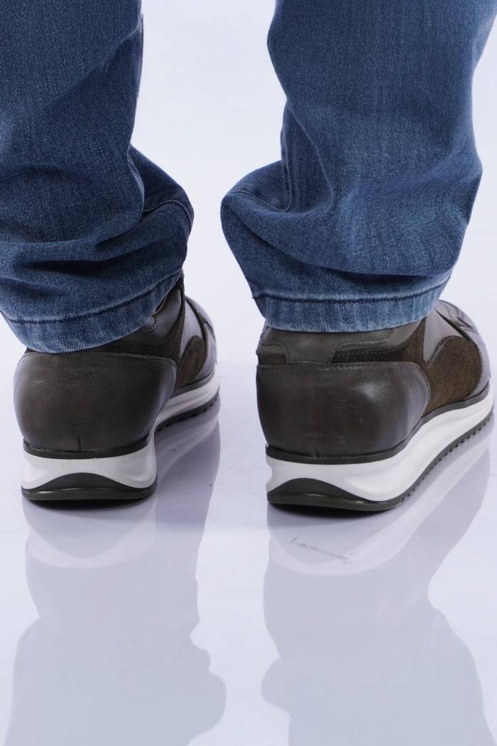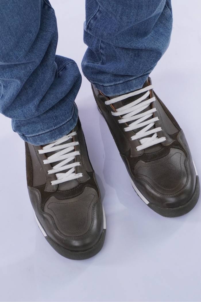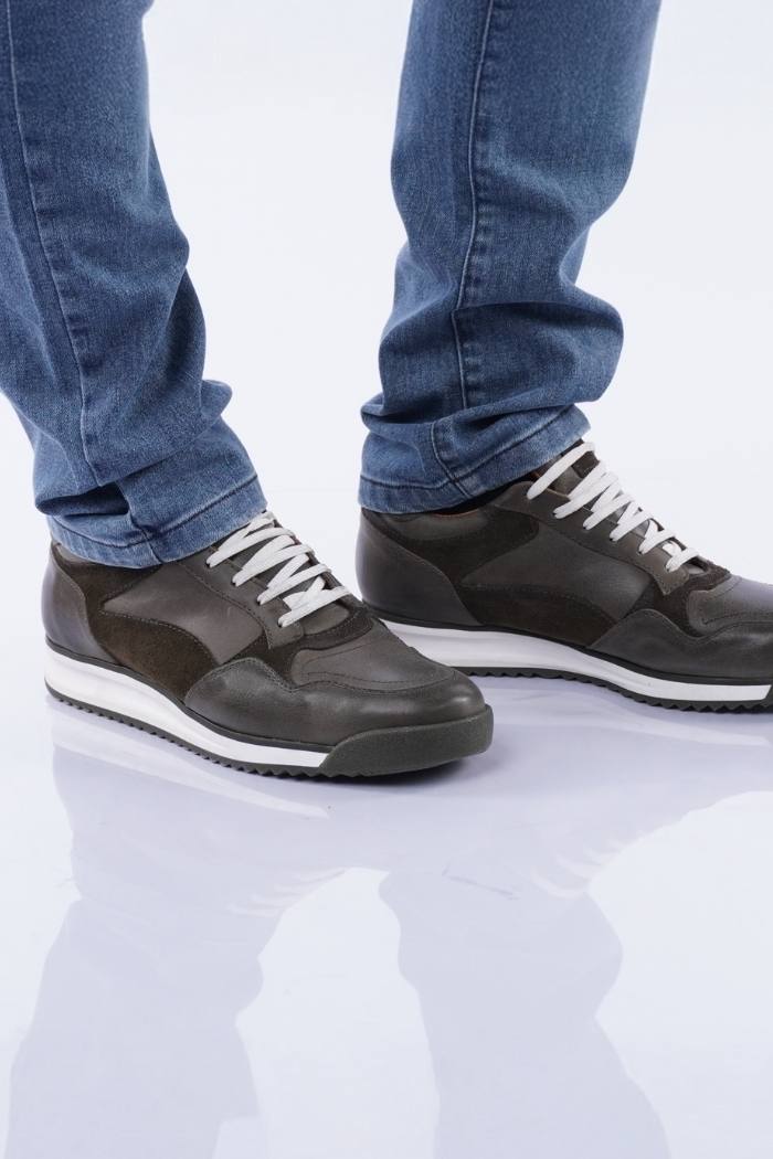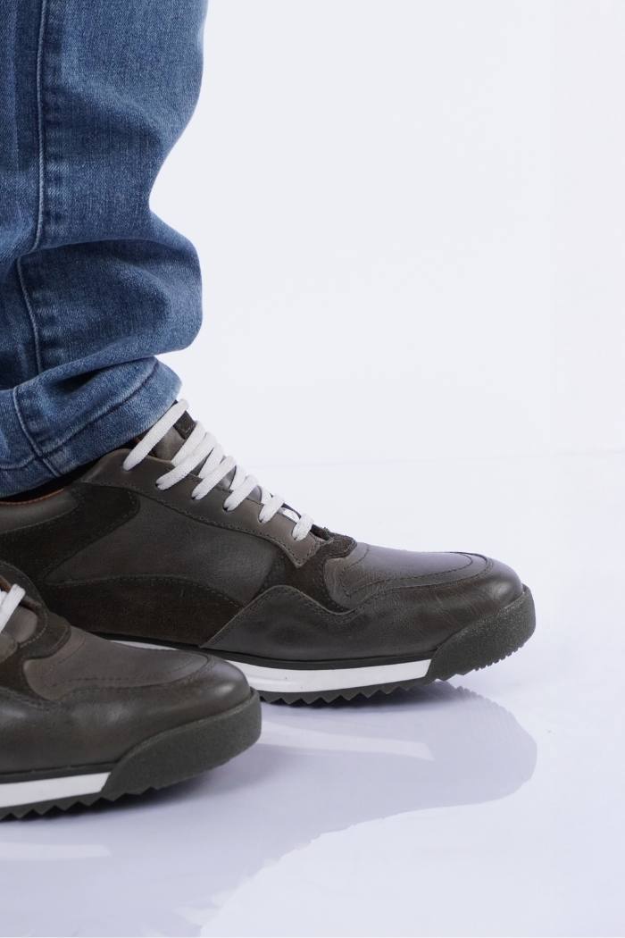 Zapatilla acordonada de cuero vacuno combinada con gamuza. Forro de cuero vacuno. Fondo goma