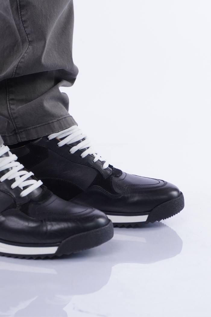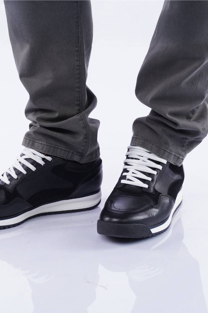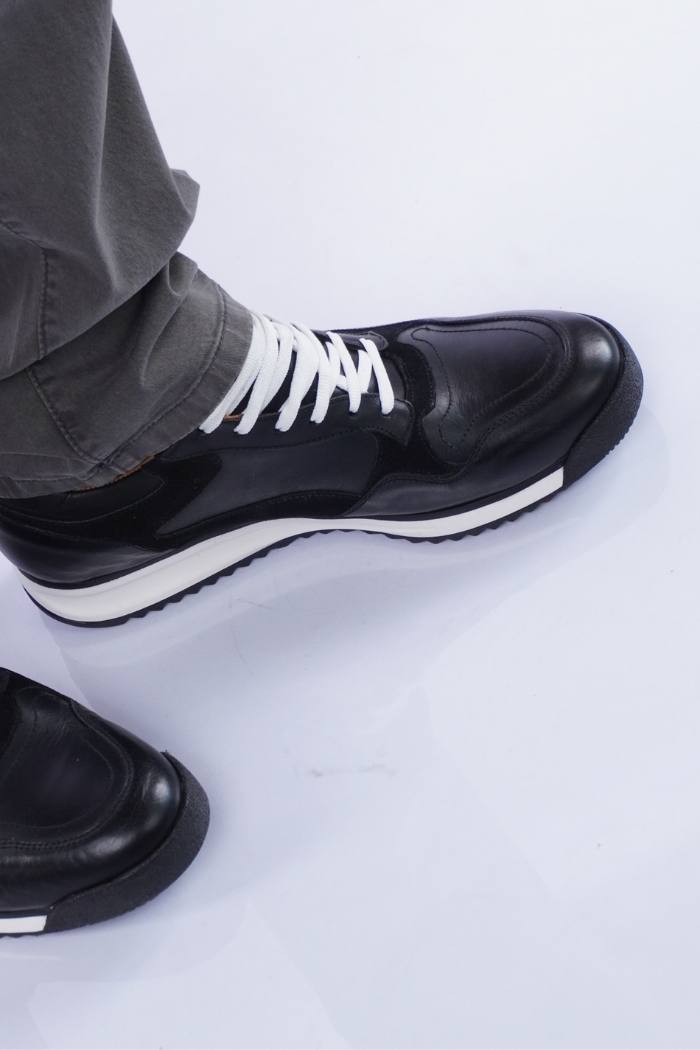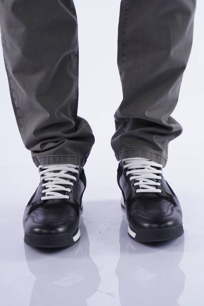 Zapatilla acordonada de cuero vacuno combinada con gamuza. Forro de cuero vacuno. Fondo goma